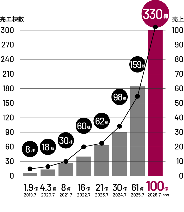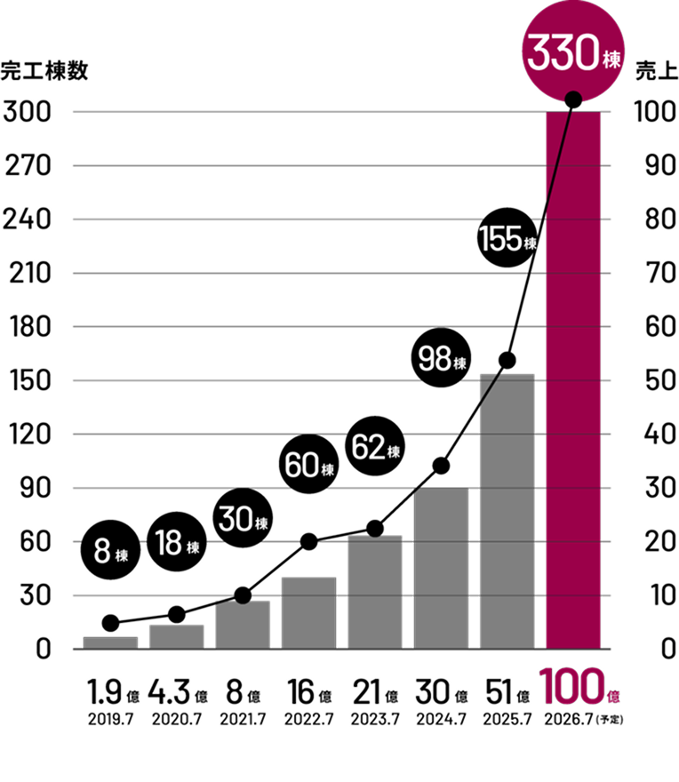 2018年の創業からたった7年で年間の完工棟数を8棟→98棟に伸ばし、2019年〜2023年度の5ヵ年の売り上げ成長率527.4%と全国一位を獲得。